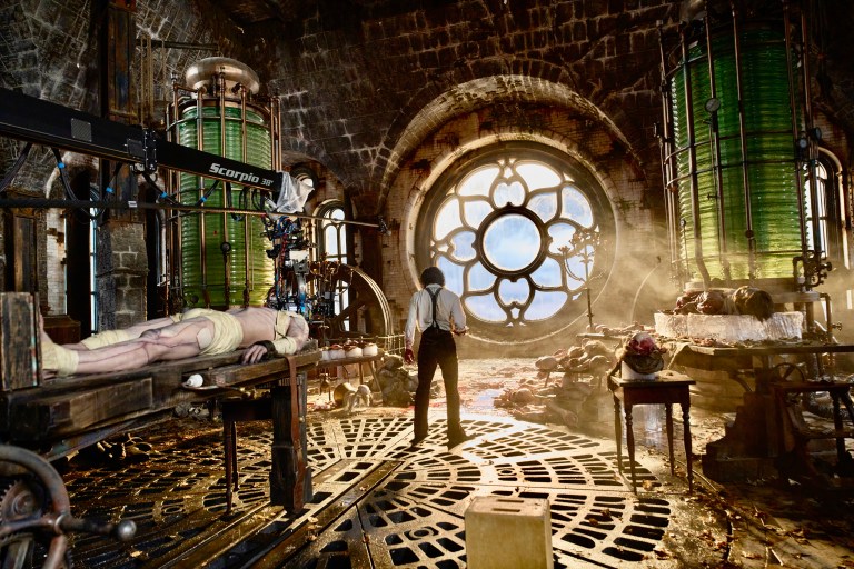 O laboratório de Victor Frankenstein é o primeiro grande manifesto visual do longa, há tubos, engrenagens, partes anatômicas e máquinas que lembram instrumentos musicais de uma ciência poética, de um período histórico, que faz menção ao cientificismo.